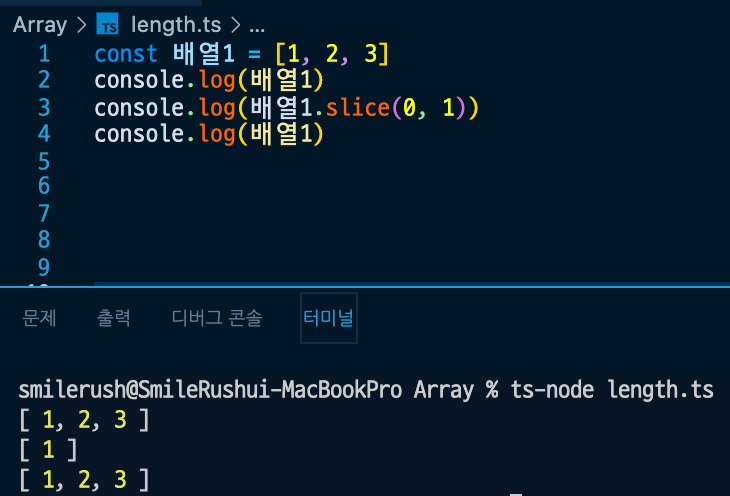 3. slice한 결과를 원본 배열은 수정하지 않고, 새로운 배열을 만들어내는 방법으로 작동한다.