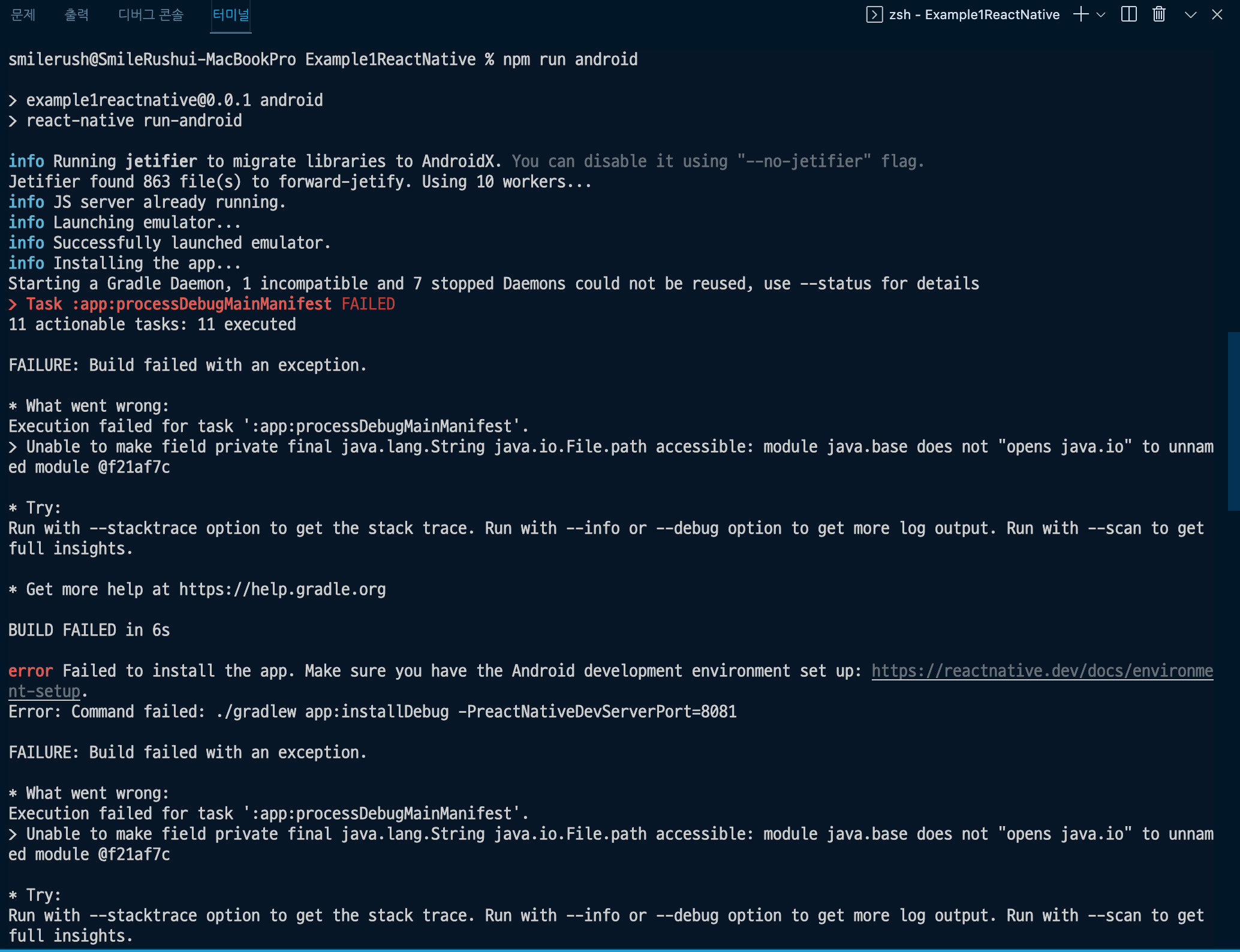 smilerush@SmileRushui-MacBookPro Example1ReactNative % npm run android